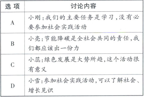 1. 教材 P12 生活观察改编 学校组织八年级学生参加宣传“节能降碳,绿色发展”的社会实践活动,几位同学就此展开了讨论。以下说法错误的是(
