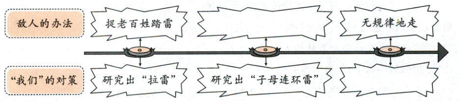 ①狡猾的敌人吃过几次苦头后,便想出了一些对付地雷的办法。他们遇见了“踏雷”,就用石灰粉在其周围撒个圈,以防接触;遇见了“绊雷”,就远远地用铁钩子钩出来。为了防止敌人排雷,我们又研究出“子母连环雷”,敌人起出母雷,子雷跟着爆炸。敌人捉老百姓在前面踏雷,我们就研究出“拉雷”,等前面的群众过去后,再拉响地雷,专炸鬼子的大队人马;敌人无规律地走,我们就实施“飞行爆炸”。