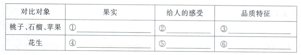 1. 选文中父亲将花生与桃子、石榴、苹果对比,让我们感受到了花生的可贵品质。回忆父亲的话,完成表格。