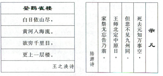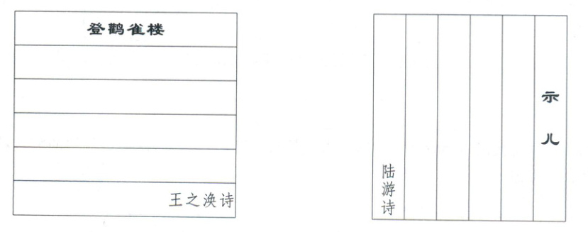 五 根据提示,用不同的格式默写古诗,注意每行诗句要居中,字距、行距要适当、匀称。