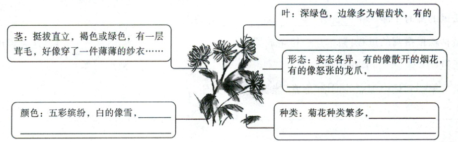 【列提纲】我会把“菊花”介绍给别人,根据提示完成下面的思维导图。