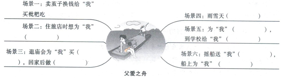 1. 首尾呼应 委婉含蓄地表达了对父亲的感激、怀念之情 2. 父亲 父亲竭尽全力支持“我”读书,“我”考取了无锡师范,他的心血没有白费 3. 父亲为“我”缝补棉被 父亲对“我”无微不至的关怀和深切的父爱 4. A