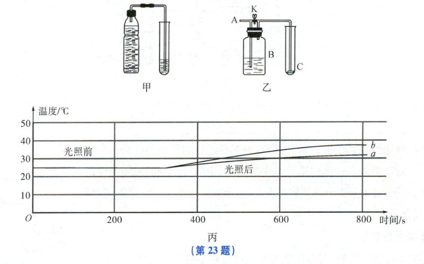 (4)该小组用空气样品和提高二氧化碳含量的空气样品,在相同条件下测定二者在光照前后温度的变化,实验结果如图丙所示,则与空气样品对应的温度变化曲线是______(填“a”或“b”),二氧化碳可以产生温室效应。请简述温室效应对人类生存环境的功与过:______(各写一点即可)。