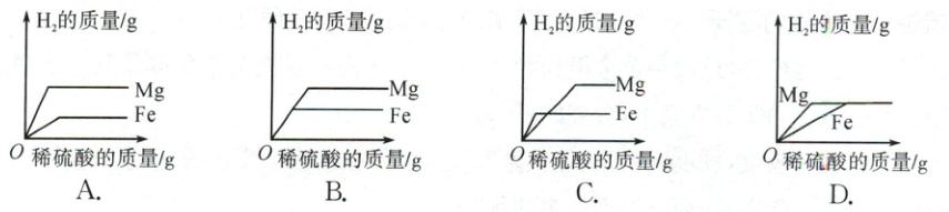 9. 将质量相等的镁粉和铁粉分别投入等质量、等浓度的稀硫酸中,所得 H₂的质量与稀硫酸的质量关系正确的是(