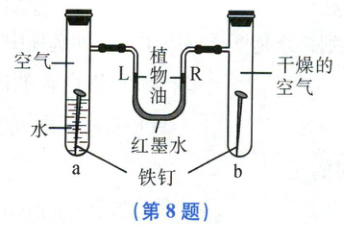 8. 如图所示为探究铁生锈条件的装置,调节 L 端和 R 端的液面高度一致,塞紧活塞,一周之后,观察现象。下列推断中错误的是(