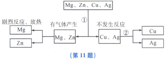 11. 某同学为探究镁、锌、铜、银的金属活动性顺序,设计如图所示的实验流程。依据流程设计,下列对物质①②的选择,合理的是(