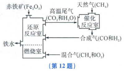 12.C 【解析】甲烷燃烧放出了大量的热,能够给炼铁提供热量,所以燃烧室中CH₄燃烧的作用是产生热量,提供高温条件,A正确。在燃烧室内,甲烷与氧气反应生成水和二氧化碳,碳元素与氧元素的化合价发生改变;在催化反应室内,甲烷与二氧化碳、水反应生成一氧化碳和氢气,碳元素与氢元素的化合价发生改变;在还原反应室内,一氧化碳、氢气与氧化铁反应生成铁、二氧化碳和水,铁元素、氢元素、碳元素的化合价发生改变。整个流程中,化合价发生改变的元素有碳、氢、氧、铁四种,B正确。由流程图可知,在整个反应过程中,甲烷是反应物,生成物中没有甲烷,所以该流程中CH₄不可循环使用,C错误。由流程图可知,催化反应室中发生的总反应的化学方程式可能为$2CH₄+H₂O+CO₂\stackrel{一定条件}{=}3CO+5H₂,$D正确。