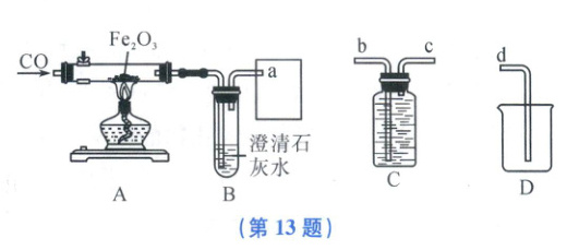 13.C 【解析】盛装试剂前应先检查装置的气密性,以防止装置漏气,A正确。实验开始先通入一氧化碳,排出装置内的空气后,再点燃酒精灯加热玻璃管中的氧化铁,先通入一氧化碳后加热的原因是排尽玻璃管中的空气,防止发生爆炸。加热后有二氧化碳生成,会观察到B中出现浑浊现象,B正确。一氧化碳难溶于水,长导管是出水管,导管口的连接顺序为a→c→b→d,C错误。生铁中含有碳等杂质,这种方法“炼”出的铁与工业上炼出的生铁在组成上最大的区别是不含碳,D正确。