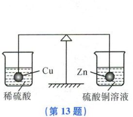 13.B 【解析】杠杆上挂的是两个球,由题意知,只有球的质量影响杠杆平衡,左边铜与稀硫酸不反应,右边锌置换出溶液中的铜,锌的相对原子质量为65,铜的相对原子质量为64,因为铜和锌都显+2价,所以一原子的锌置换出一原子的铜,则右边球的质量减小,同时溶液的质量变大。因为左边球的质量不变,右边球的质量变小,所以去掉烧杯后,杠杆不再保持平衡。