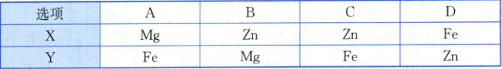 15. 在已调平的天平两端各放一个等质量的烧杯,向烧杯中各注入质量相等、溶质质量分数也相等的足量稀硫酸。在左边烧杯中投入一定质量的金属$X$粉末,同时在右边烧杯中投入与$X$等质量的金属$Y$粉末。观察到天平的指针先偏向左边,当两种金属完全反应后,天平的指针偏向右边,则$X$、$Y$是下表组合中的(