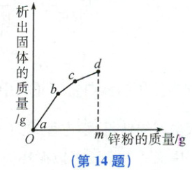 14. 往硝酸铜、硝酸银和硝酸亚铁的混合溶液中缓慢连续加入质量为$m$的锌粉,溶液中析出固体的质量与参加反应的锌粉质量的关系如图所示。下列说法中正确的是(