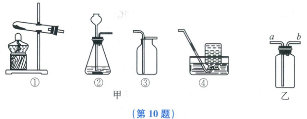 10.A 【解析】装置①不可直接用于高锰酸钾制取氧气,还应在试管口放一团棉花,A错误;装置②中的长颈漏斗换成分液漏斗就可以控制反应的速率,B正确;装置④收集到的氧气比装置③收集到的氧气更纯净,C正确;用题图乙中的装置代替装置③收集氧气时,氧气的密度大于空气,应该从a端进气,故应将带火星的木条放在导管b处进行验满,D正确。