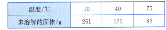 (1)根据硝酸钾的溶解度曲线可知,温度从 10℃升高至 40℃时,硝酸钾的溶解度从 20.7g 增大到 63.7g,溶解度增加了 $63.7g-20.7g=43g$,而实验中溶解硝酸钾的质量增加了 $261g-175g=86g$,因此可知实验中所用水 $n$ 为 200g;200g 水在 10℃时最多能溶解硝酸钾 $20.7g × 2=41.4g$,则原固体混合物的质量为 $41.4g+261g=302.4g$;温度从 40℃升高至 75℃时,硝酸钾的溶解度增加了 $150g-63.7g=86.3g$,则 200g 水从 40℃升高至 75℃时可以多溶解硝酸钾的质量为 $86.3g × 2=172.6g$,而实验中固体质量只减少了 $175g-82g=93g$,说明所剩余 82g 固体不含硝酸钾,全部为不溶于水的杂质,则原固体混合物中硝酸钾的质量 $m=302.4g-82g=220.4g$。