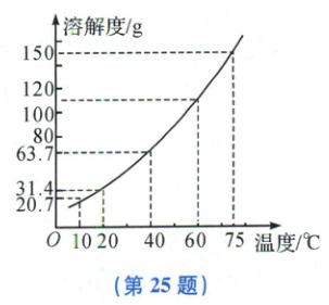 25. (10分)某固体混合物中含有mg硝酸钾和若干克不溶于水的杂质,将此混合物加入ng水中,在10℃、40℃、75℃时观察,充分溶解后的结果如下表所示,硝酸钾的溶解度曲线如图所示。