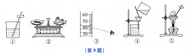 9.B 【解析】粗盐的主要成分是氯化钠,粗盐提纯是通过溶解(把不溶物与氯化钠初步分离)、过滤(把不溶物彻底除去)、蒸发(把氯化钠从溶液中分离出来)得到精盐的过程;用提纯得到的精盐配制溶质质量分数为16%的氯化钠溶液50g,首先计算配制溶液所需氯化钠和水的质量,再称量所需的氯化钠和量取水,最后进行溶解,这两个实验的正确操作顺序是①④⑤②③①,A正确;指针偏左,说明氯化钠的质量大于砝码的质量,应减小氯化钠的质量,直至天平平衡,B错误;用量筒量取水时,仰视液面,读数比实际液体体积小,会造成实际量取的水的体积偏大,则使得到的氯化钠溶液的溶质质量分数偏小,C正确;蒸发时,应用玻璃棒不断搅拌,以防止局部温度过高,造成液体飞溅,D正确。