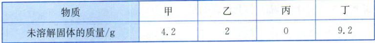 11.C 【解析】由丙物质未溶解固体的质量为0可知,丙溶液可能为饱和溶液,也可能为不饱和溶液,A错误;溶剂质量相同,而丁溶液的溶质质量最小,所以丁溶液的溶质质量分数最小,B错误;通过分析可知,四种溶液中溶剂都是50g,丙溶解得最多,其次是乙,然后是甲,丁溶解得最少,所以20℃时四种物质溶解度的关系为丙>乙>甲>丁,C正确;四杯溶液中溶剂的质量都为50g,D错误。