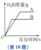 10.B 【解析】反应生成H₂的质量与反应时间的关系如题图所示,相同时间内B生成氢气的质量大于A,可判断金属活动性B>A,A错误;根据反应生成H₂的质量与反应时间的关系,在两种金属完全反应后,生成H₂的质量A>B,B正确;金属与酸反应生成氢气时,氢气来源于酸中的氢元素,所以生成氢气的质量与消耗的酸的质量成正比,则反应的硫酸质量A>B,C错误;两种金属的相对原子质量和化合价不确定,所以不能确定参加反应的两种金属质量的大小,D错误。