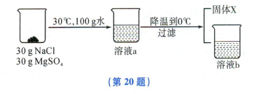 20.(6 分)运城盐湖含盐量极高,其主要成分为 MgSO₄和 NaCl,两物质的溶解度如下表所示。随着温度的变化,该盐湖会析出不同的物质,水温在 10℃左右开始析出 NaCl,在 0℃时开始析出 MgSO₄。