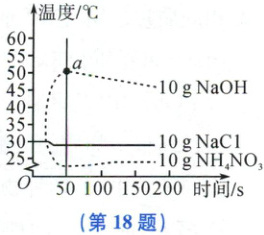 18.(3 分)将 NaOH、NaCl、NH₄NO₃固体各 10g 分别放入盛有 100mL 水的烧杯中充分溶解。在不同时间测量溶液的温度,绘制成如图所示的图像,分析图像并回答下列问题: