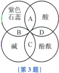 3. 小李在学习酸碱指示剂与常见的酸、碱溶液作用时,归纳了如图所示的关系。图中A、B、C、D是两圆相交的部分,分别表示指示剂与酸、碱溶液作用时所显示出的颜色,其中表示不正确的是(