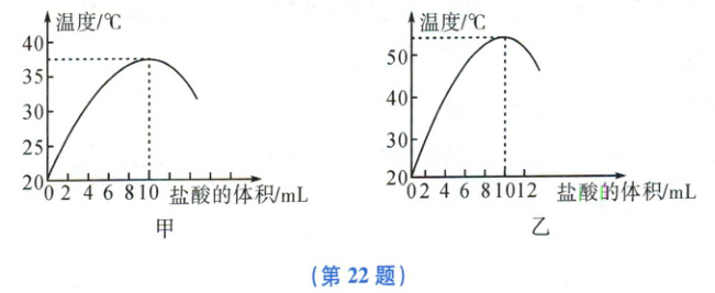 取20℃时的NaOH溶液10mL于烧杯中,逐滴滴入稀盐酸,然后用温度计测量溶液的温度。随着盐酸的加入,烧杯中溶液的温度与加入盐酸体积之间的变化关系如图甲所示。