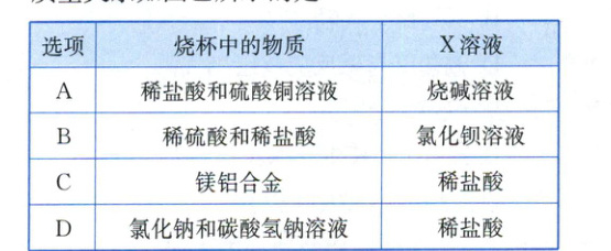 13.A 【解析】烧碱即氢氧化钠,将烧碱溶液滴入稀盐酸和硫酸铜的混合溶液中,氢氧化钠先与稀盐酸反应生成氯化钠和水,稀盐酸反应完后,氢氧化钠再与硫酸铜反应生成氢氧化铜沉淀和硫酸钠,A正确;稀硫酸和氯化钡反应生成难溶于酸的硫酸钡沉淀,即将氯化钡溶液滴入稀硫酸和稀盐酸的混合溶液中马上产生沉淀,即生成沉淀的起点为原点,B错误;镁、铝都能和稀盐酸反应生成气体,且只要接触就能产生氢气,即生成气体的起点为原点,C错误;碳酸氢钠能与稀盐酸反应生成二氧化碳气体,只要接触就能产生二氧化碳,即生成气体的起点为原点,D错误。