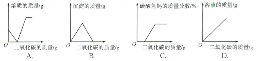 12. 已知CO₂ + H₂O + CaCO₃ = Ca(HCO₃)₂,下列图像表示将CO₂气体缓缓通入一定质量的饱和石灰水中时某些量随通入CO₂质量的变化趋势,其中不正确的是(