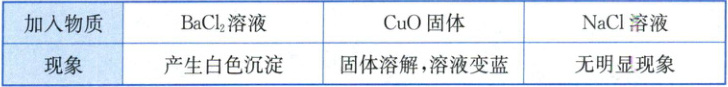 11. 有一无色液体X,分成等量的三份,向其中分别加入少量的BaCl₂溶液、CuO固体、NaCl溶液,产生的现象如下表所示。该无色液体X是(