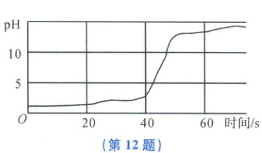 12.D 【解析】在 0 s 至 40 s 之间,溶液的 pH 小于 7,显酸性,溶液中的溶质为 HCl、NaCl,A 错误;20 s 时,溶液的 pH 小于 7,显酸性,B 错误;60 s 时,溶液的 pH 大于 7,显碱性,取适量所得溶液加入锌粒,没有气泡产生,C 错误;图像中 pH 的变化是从小于 7 逐渐增大到大于 7,可知原溶液显酸性,然后不断地加入碱性溶液,使 pH 增大,说明是将氢氧化钠溶液滴入稀盐酸中,D 正确。