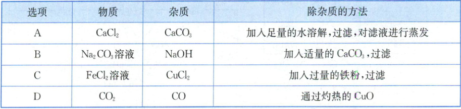 11.B 【解析】CaCl₂ 易溶于水,CaCO₃ 难溶于水,可采取加足量的水溶解、过滤、对滤液进行蒸发的方法进行分离除杂,A 正确;CaCO₃ 不能与 NaOH 反应,不能除去杂质,B 错误;过量的铁粉能与 CuCl₂ 反应生成氯化亚铁和铜,再过滤,能除去杂质且没有引入新的杂质,符合除杂原则,C 正确;CO 能与灼热的氧化铜反应生成铜和二氧化碳,能除去杂质且没有引入新的杂质,符合除杂原则,D 正确。
