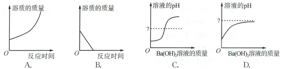 9.C 【解析】由题意知,稀硫酸与氢氧化钡反应生成硫酸钡沉淀和水,两种反应物的相对分子质量分别为 98、171,质量分别为 0.98g、2g,则氢氧化钡溶液过量。随着反应的进行,溶质质量减小,当完全反应后,再继续滴加氢氧化钡溶液,溶质质量增大,A、B 不正确;稀硫酸和氢氧化钡反应生成硫酸钡沉淀和水,随着反应的进行,溶液的酸性减弱,pH 升高,当恰好完全反应时,溶液的 pH 等于 7,继续滴加氢氧化钡溶液,溶液显碱性,pH 升高,C 正确、D 不正确。
