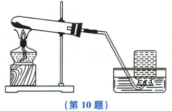 10.B 【解析】用排水法收集氧气时,加热前,将集气瓶注满水,用玻璃片盖着倒立在盛水的水槽中,A正确;用排水法收集氧气时,当气泡均匀连续地产生时,才开始收集氧气,不能先将导管口伸入集气瓶,B错误;用排水法收集满氧气后,先用玻璃片将集气瓶盖好,再移出水槽正放在桌子上,C正确;氧气收集完毕,如果先将酒精灯熄灭,则试管内压强变小,水会沿导管倒流进试管,所以实验结束时,先把导管移出水面,再熄灭酒精灯,D正确。