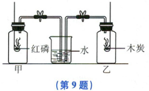 9.C 【解析】甲瓶中红磷燃烧生成的五氧化二磷是固体,消耗了瓶中的氧气,使压强减小,小于大气压,从而使水进入甲瓶中,且流入水的体积约占集气瓶体积的$\frac{1}{5}$;乙瓶中木炭燃烧生成的二氧化碳是气体,虽然消耗了氧气,但是二氧化碳代替了氧气的位置,使压强几乎不变,水不能进入乙瓶中。