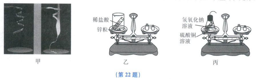 22. (10分)某化学兴趣小组的同学设计了如图甲、乙、丙所示的三个实验来验证质量守恒定律。