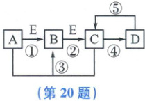 20.(7 分)A、B、C、D、E 是初中化学中常见的五种物质。在通常情况下,A 为黑色粉末状固体,B、C 均为无色无味的气体,D 为不溶于水的白色固体,在实验室常用含 D 的物质与稀盐酸反应制取 C,单质 E 是组成空气的主要成分之一,它们之间的关系如图所示(图中反应条件及反应④和⑤中某些反应物、生成物已略去)。请回答下列问题: