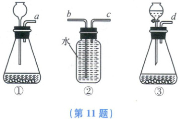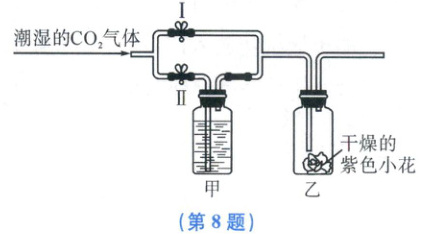 8.C 【解析】先关闭Ⅰ,打开Ⅱ,让潮湿的二氧化碳气体经过甲瓶中的浓硫酸干燥后进入乙瓶,干燥的紫色小花不变红,因为干燥的二氧化碳不能使石蕊变成红色;再关闭Ⅱ,打开Ⅰ,进入乙瓶中的是潮湿的二氧化碳,二氧化碳和水反应产生的碳酸使紫色小花变成红色。