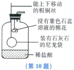 10.B 【解析】生成的二氧化碳溶于水生成碳酸,碳酸显酸性,能使紫色石蕊溶液变红,故浸有紫色石蕊溶液的棉花会变红,A错误。将粗铜丝放下,使装有石灰石的尼龙袋与稀盐酸接触,反应发生;将粗铜丝往上提,则反应终止;粗铜丝能控制反应的发生和停止,B正确。生石灰是氧化钙的俗称,氧化钙能与二氧化碳反应,所以不能用生石灰来干燥二氧化碳气体,C错误。由装置图可知,该实验不能验证二氧化碳的密度比空气大,D错误。