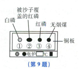 9. 用如图所示的装置进行实验,升温至 $ 60^{\circ}C $ 的过程中,仅①燃烧;继续升温至 $ 260^{\circ}C $ 的过程中,仅③燃烧。下列分析中,不正确的是(