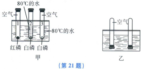 21. (8 分)为了验证可燃物燃烧的条件,某化学兴趣小组的同学做了如图甲所示的实验。已知白磷的着火点为 $ 40^{\circ}C $,红磷的着火点是 $ 260^{\circ}C $。