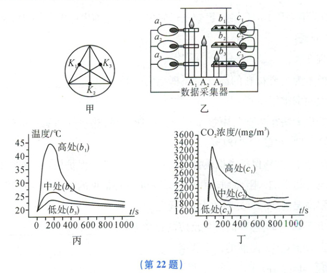 22. (14 分)某化学兴趣小组利用手持技术(利用传感器和数据采集器实时测量的技术)测量模拟建筑火灾现场中氧气含量、二氧化碳浓度和温度的变化,验证建筑火灾逃生策略的合理性。在如图甲所示的圆筒形透明塑料实验容器底部 3 个点($ K_{1} $、$ K_{2} $、$ K_{3} $)分别放置 $ A_{1} $、$ A_{2} $、$ A_{3} $ 3 根高低不同的蜡烛,如图乙所示。在距 3 根烛芯一定距离都依次放置氧气传感器($ a_{1} $、$ a_{2} $、$ a_{3} $)、温度传感器($ b_{1} $、$ b_{2} $、$ b_{3} $)和二氧化碳传感器($ c_{1} $、$ c_{2} $、$ c_{3} $),点燃蜡烛后,盖上实验容器顶盖后,采集 3 根蜡烛火焰附近相关数据。