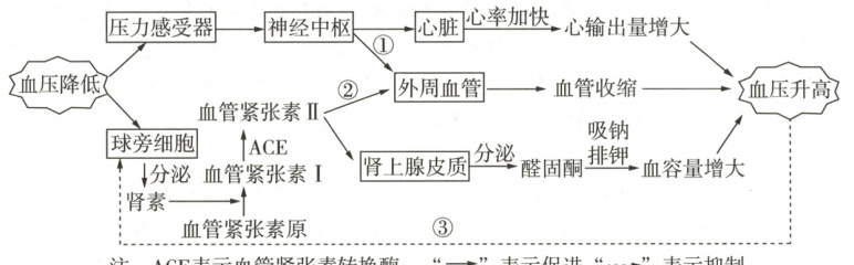 2. [2025江西师大附中12月联考]肾素—血管紧张素—醛固酮系统(RAAS)是人体重要的体液调节方式,RAAS激活过程如图所示,该过程过度激活会引起肾源性高血压。据图回答下列问题: