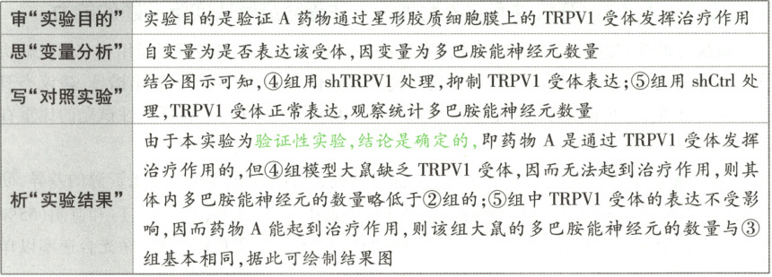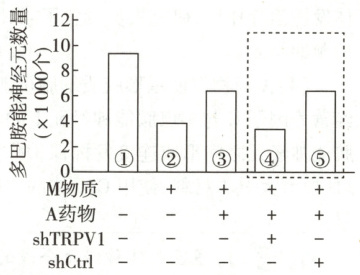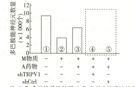 (3)星形胶质细胞(一种神经胶质细胞)膜上存在 TRPV1 受体,为验证 A 药物通过该受体发挥治疗作用,研究人员设置了④、⑤处理组。在图中虚线框内,以柱状图的形式画出相应的预期结果。