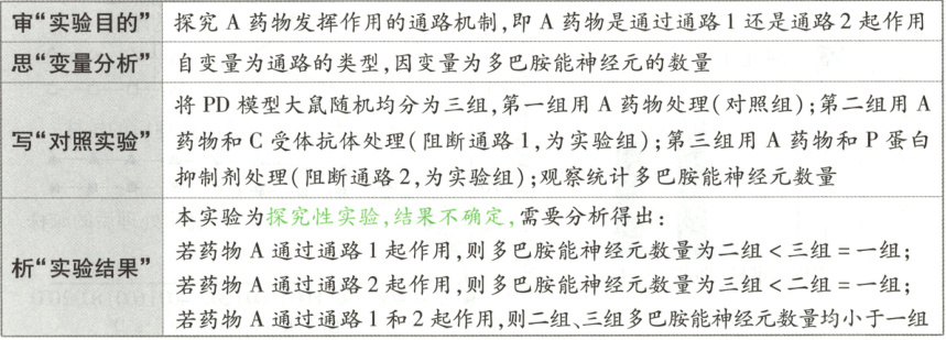 (4)实验思路:将 PD 模型大鼠随机均分为三组,第一组用 A 药物处理,第二组用 A 药物和 C 受体抗体处理,第三组用 A 药物和 P 蛋白抑制剂处理,观察多巴胺能神经元数量。预期结果:若二组 < 三组 = 一组,则药物 A 通过通路 1 起作用;若三组 < 二组 = 一组,则药物 A 通过通路 2 起作用;若二组、三组均小于一组,则药物 A 通过通路 1 和 2 起作用