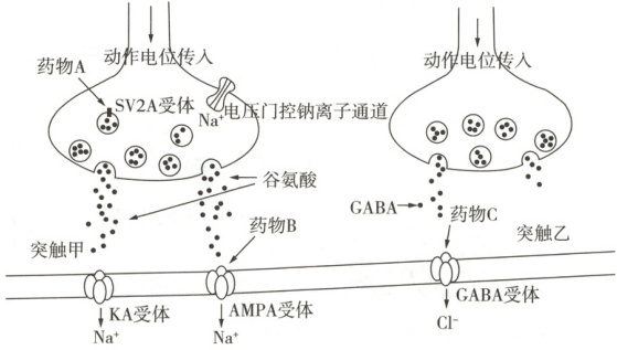 1. 试题调研原创 癫痫由部分运动神经元持续兴奋引起,发作时常表现为抽搐。如图为两个上游神经元与癫痫发病的关键运动神经元(下方细胞膜所在神经元)形成的突触甲、乙,以及治疗癫痫的药物A、B、C的作用示意图,图中KA受体、AMPA受体、GABA受体均关联相应离子通道并控制其开放和关闭。据图分析,下列叙述错误的是