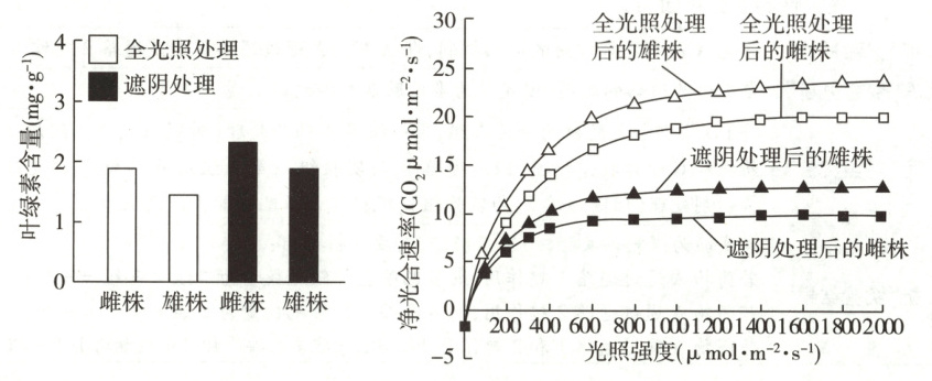 (3)在相同光照(全光照或遮阴)条件下,雄株的生物量(干重)均高于雌株。不考虑呼吸速率的差异,据图推测该种杨树雌株和雄株的光资源竞争策略分别是________。