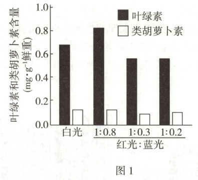 (2) 实验发现红光:蓝光 = 1:0.8组的光合速率最高,结合图1结果和色素对光的吸收光谱,分析可能的原因是________________________和________________________。