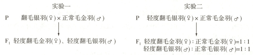(3)实验二中F₁雌雄鸡随机交配产生F₂,F₂中羽毛反卷程度的表型及比例为______,F₂中翻毛金羽雄鸡所占的比例为______。实验一中F₁雌雄鸡随机交配产生F₂,仅从羽毛反卷程度和羽色分析(不分雌雄):F₂的表型有______种,F₂中与F₁表型不同的个体所占比例为______。为挑选适合我国南方地区养殖的优质蛋鸡,可从轻度翻毛银羽雌鸡和轻度翻毛金羽雄鸡杂交后代中选育表型为______的雏鸡。