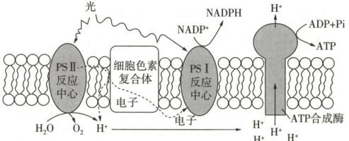 (2)据文中信息可知,PSⅡ中的______吸收光能,可将水裂解为氧气和 $H^{+}$,产生的电子经一系列传递,与 $NADP^{+}$ 和 $H^{+}$ 结合形成______,将光能转变为______。