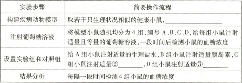 (4)成纤维生长因子1(FGF1)是一种内源性蛋白类激素,研究表明FGF1具有降低血糖的作用。FGF1可能通过提升胰岛素敏感性降低血糖,也可能自身具有降低血糖的作用。为了研究FGF1降低血糖的原理,某实验小组进行了如表所示实验,请对表格进行完善: