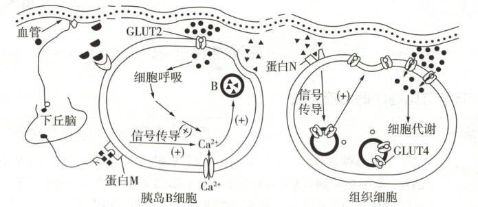 注:GLUT是一类镶嵌在细胞膜上的葡萄糖转运蛋白;“▲”为胰岛素分子,“●”为葡萄糖分子